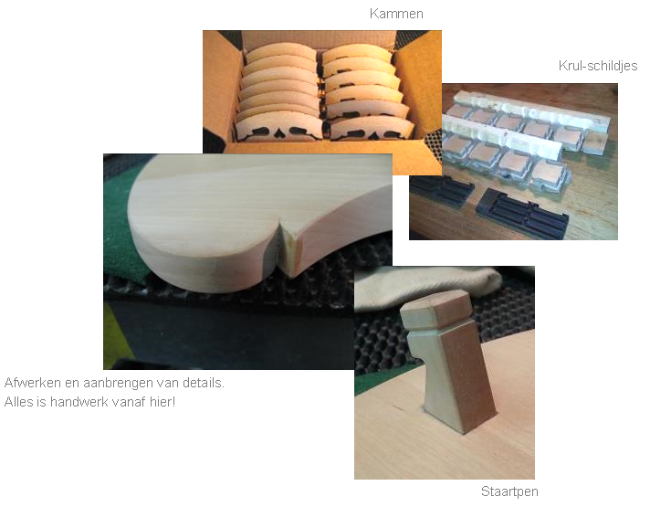 Het is een uitdaging om aan het juiste hout te komen! Omdat het instrument uit 1 stuk wordt vervaardigt is vooral de dikte een probleem. In Nederland is het vrijwel niet mogelijk grote stukken hout op de gewenste dikte te krijgen, hiervoor moesten we naar zuid-Duitsland. |